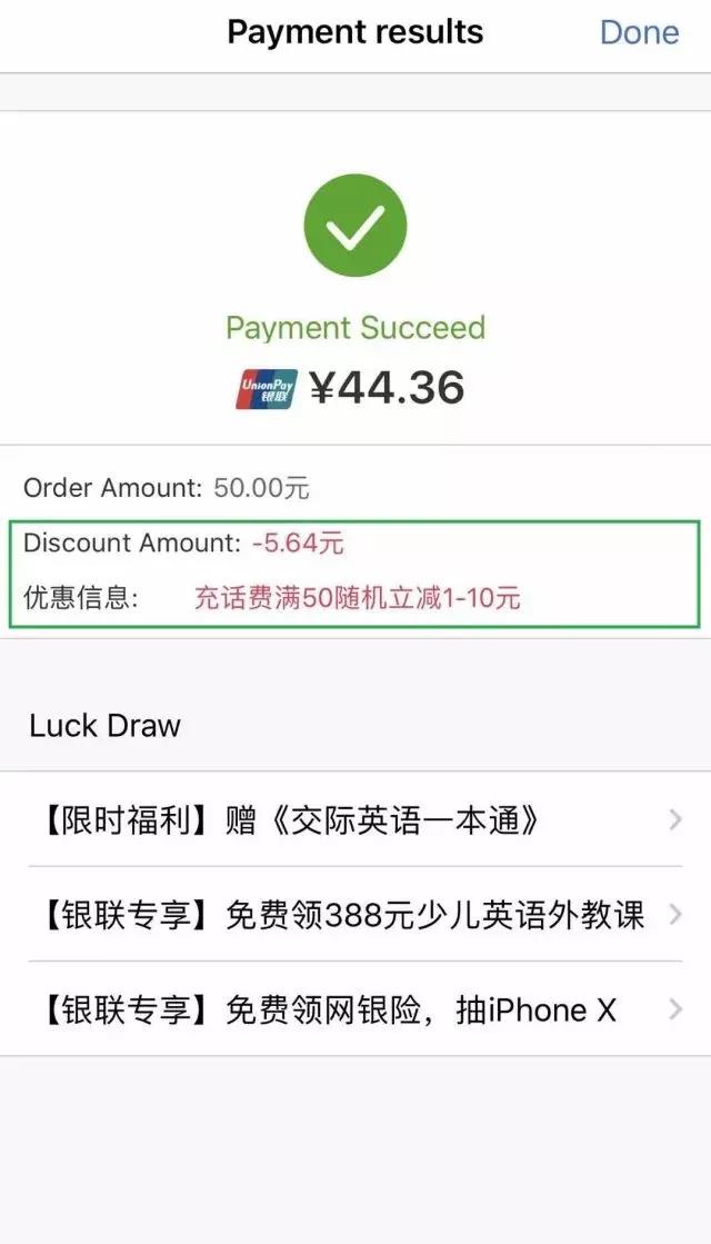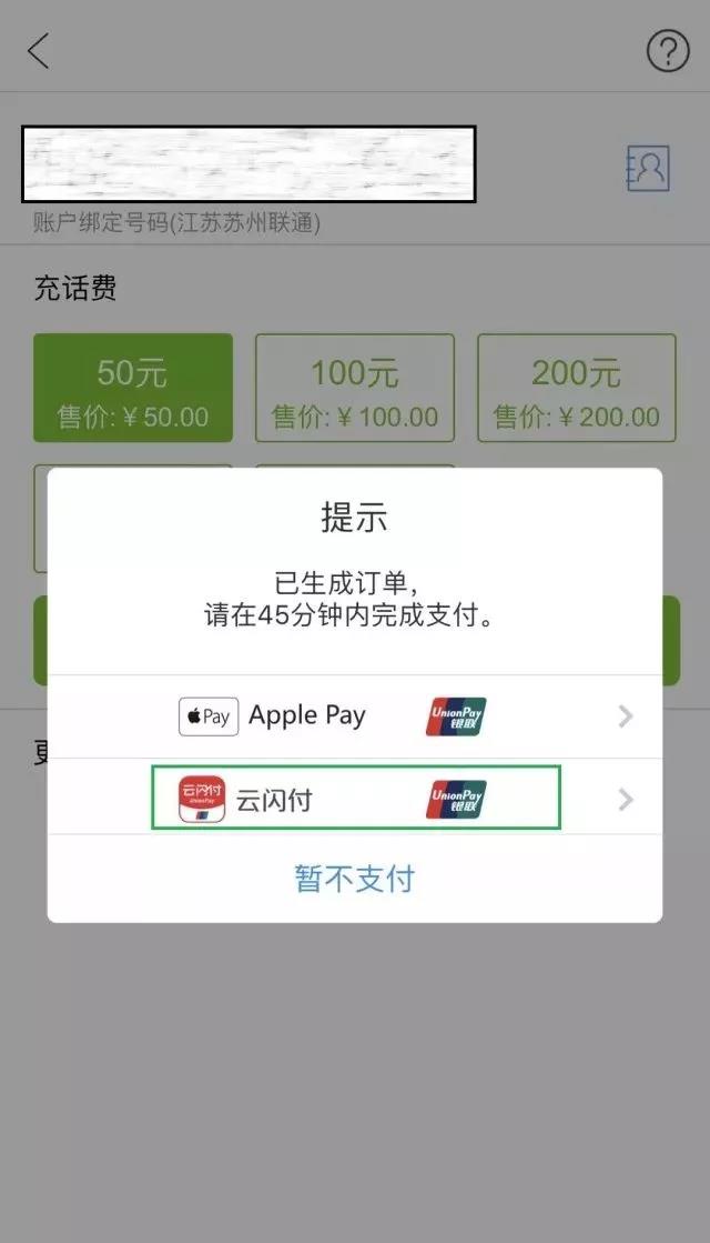 在云闪付APP内进行手机充值时选择【云闪付】付款 , , , ,充值金额(非实付金额)满50元 , , , ,即可享受随机立减1-10元优惠 。活动期间每日限量5万笔 , , , ,单用户每自然月限享受1笔优惠 , , , ,数量有限 , , , ,先到先得 。
